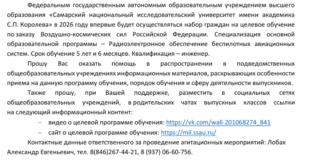 • О наборе абитуриентов на целевое обучение по специальности Радиоэлектронное обеспечение беспилотных авиационных систем в Самарском университете 30.03.2026